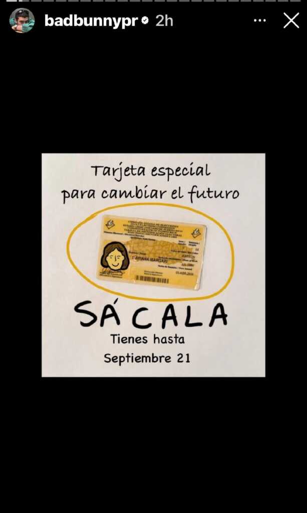 Otro “story” es una especie de meme en la que aparece una tarjeta electoral. El texto reza “Tarjeta especial para cambiar el futuro. Sácala tienes hasta el 21 de septiembre”. En otro “story” aparece lo que se deduce es él sujetando su tarjeta electoral.