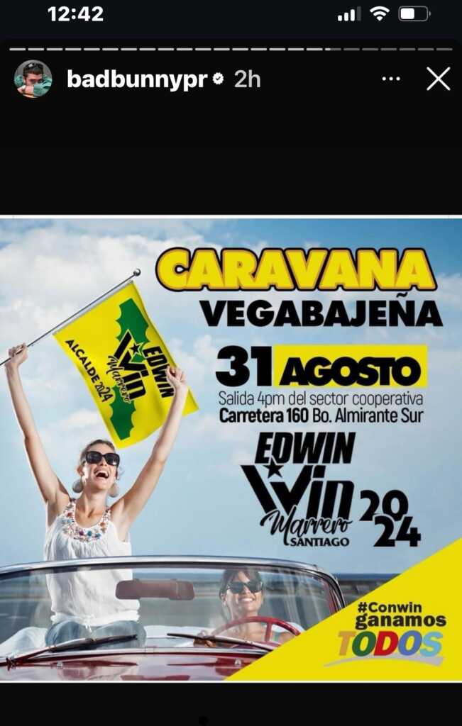 El famoso artista sigue utilizando los “stories” su cuenta en la red social Instagram para comunicarse con sus miles de fanáticos. Hoy jueves, Bag Bunny invita a un candidato a la alcaldía de Vega Baja, Win Marrero Santiago, que será este sábado 31 de agosto desde las 4:00 p.m. de una cooperativa que ubica en la carretera 160 en el Barrio Almirante sur. No queda claro si el artista estará presente en esta actividad.